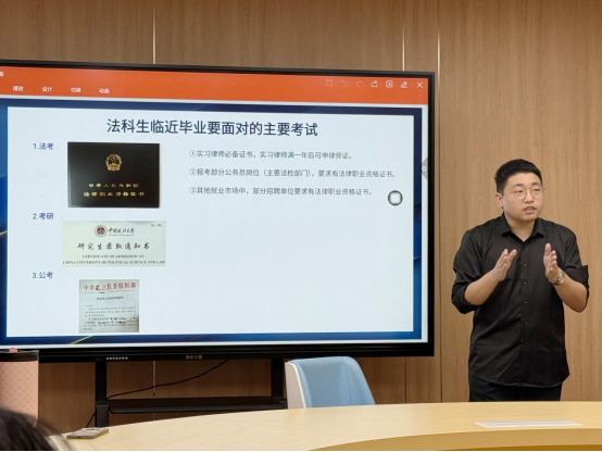 讲座中,任禹行老师以法科生毕业三大核心赛道为切入点,围绕法考、考研、公考的核心要求与发展方向展开系统讲解,重点针对法考与考研的平衡问题进行深度拆解。结合两大考试的时间节点、考查特点与备考规律,任老师为同学们梳理出科学清晰的备考时间轴,明确不同阶段的核心学习任务与优先级,切实破解“双线备考”中的时间冲突与精力分配难题。